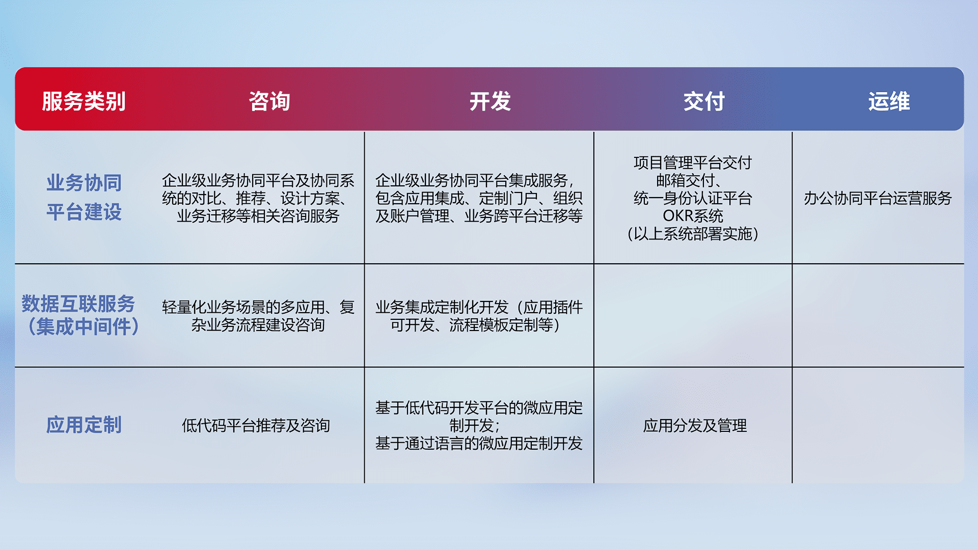 针对钉钉、、、企微、、、IDaas等平台级产品提供产品的规划、、方案、、、交付、、、定制化开发等服务,,,实现如统一协同办公、、、智能客户服务、、混合会议管理、、、、智能数据查询、、、等业务场景,,,,实现数字化转型。。。
