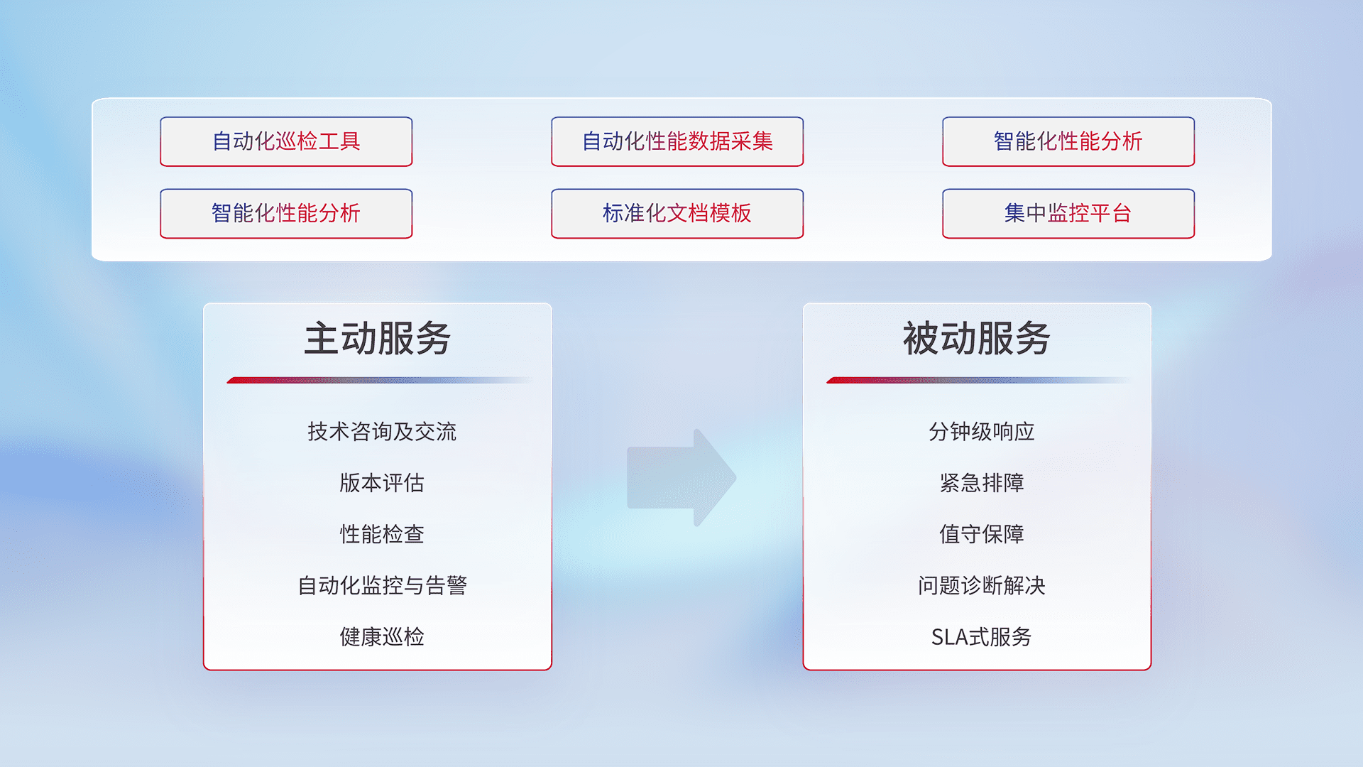智能化工具和标准化文档,,保障服务质量,,,提供主动服务(包含技术咨询、、、、版本评估、、性能检查、、、、自动化监控与告警、、健康巡检)和被动服务包含(分钟级响应、、、、紧急排障、、、、值守保障、、问题诊断解决、、、SLA服务)。。。。